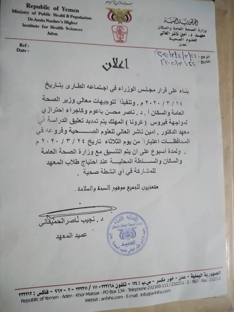 تمديد تعليق الدراسة للمعهد و فروعه إسبوع آخر بسبب جائحة فيروس كورونا (COVID 19)تقرر تمديد تعليق الدراسة في معهد د. أمين ناشر العالي للعلوم الصحية و فروعه في المحافظات إسبوعا اخر اعتبارا من يوم الثلاثاء ٢٤ / ٣ / ٢٠٢٠ م 2020-03-22zuhaer ahmad