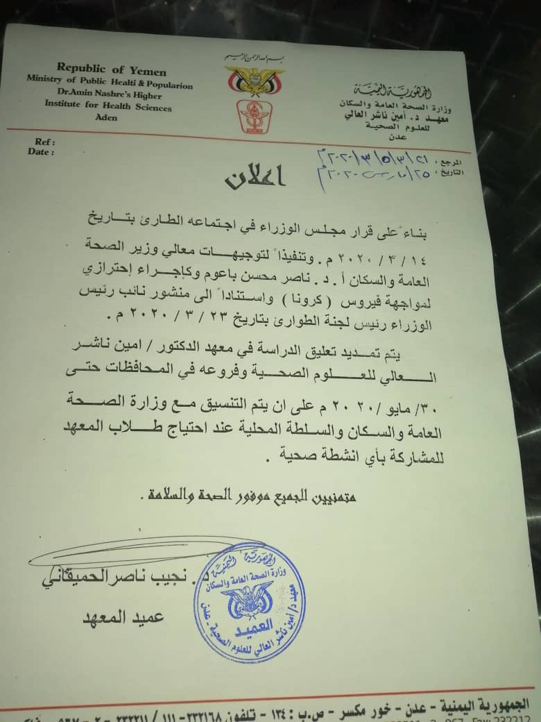 بناءاً على قرار مجلس الوزارء و توجيهات أ.د. ناصر محسن باعوم وزير الصحة العامة و السكان و إستناداً لمنشور نائب رئيس مجلس الوزراء رئيس لجنة الطوارئ بشأن وباء كورونا بتاريخ 23 / 3 / 2020م