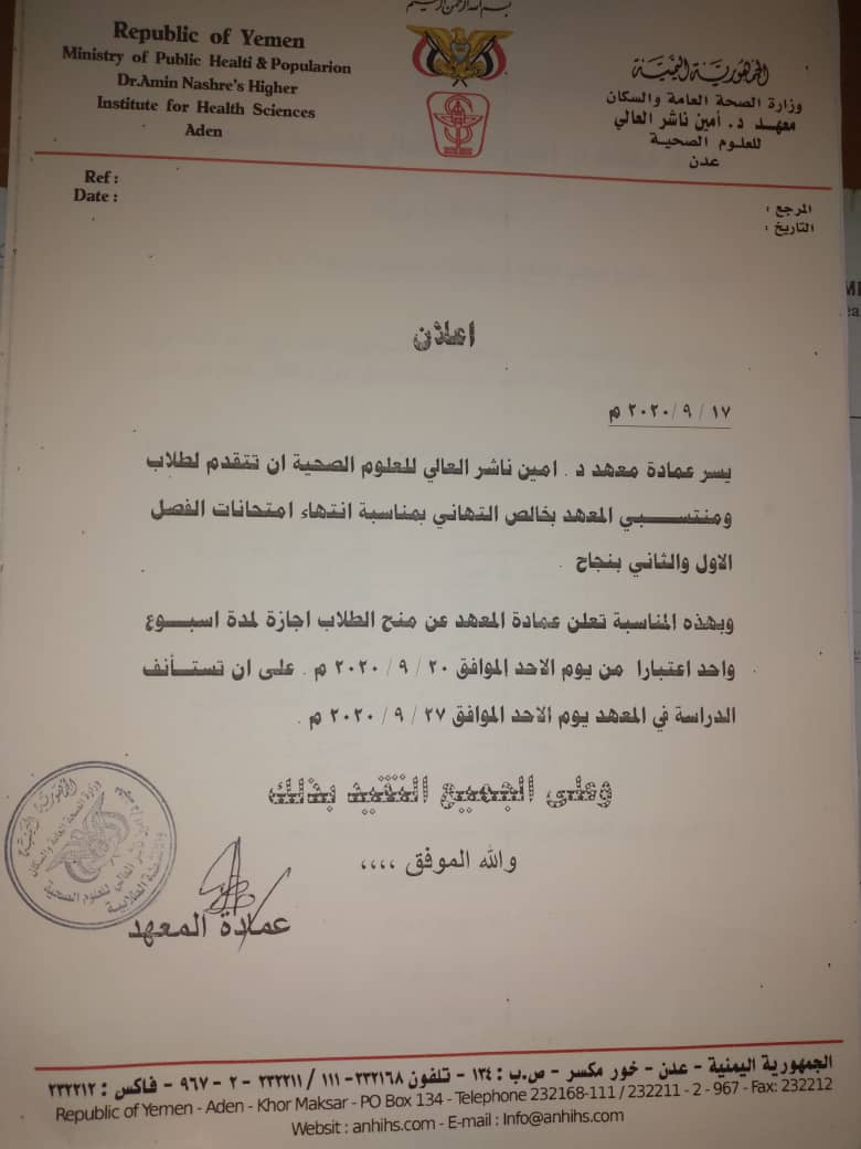 و بهذة المناسبة تعلن عمادة المعهد عن منح الطلاب إجازة لمدة إسبوع واحد إعتبارا من يوم الاحد الموافق ٢٠ / ٩ /٢٠٢٠م على ان تستأنف الدراسة في المعهد يوم الاحد الموافق ٢٧ / ٩ / ٢٠٢٠م