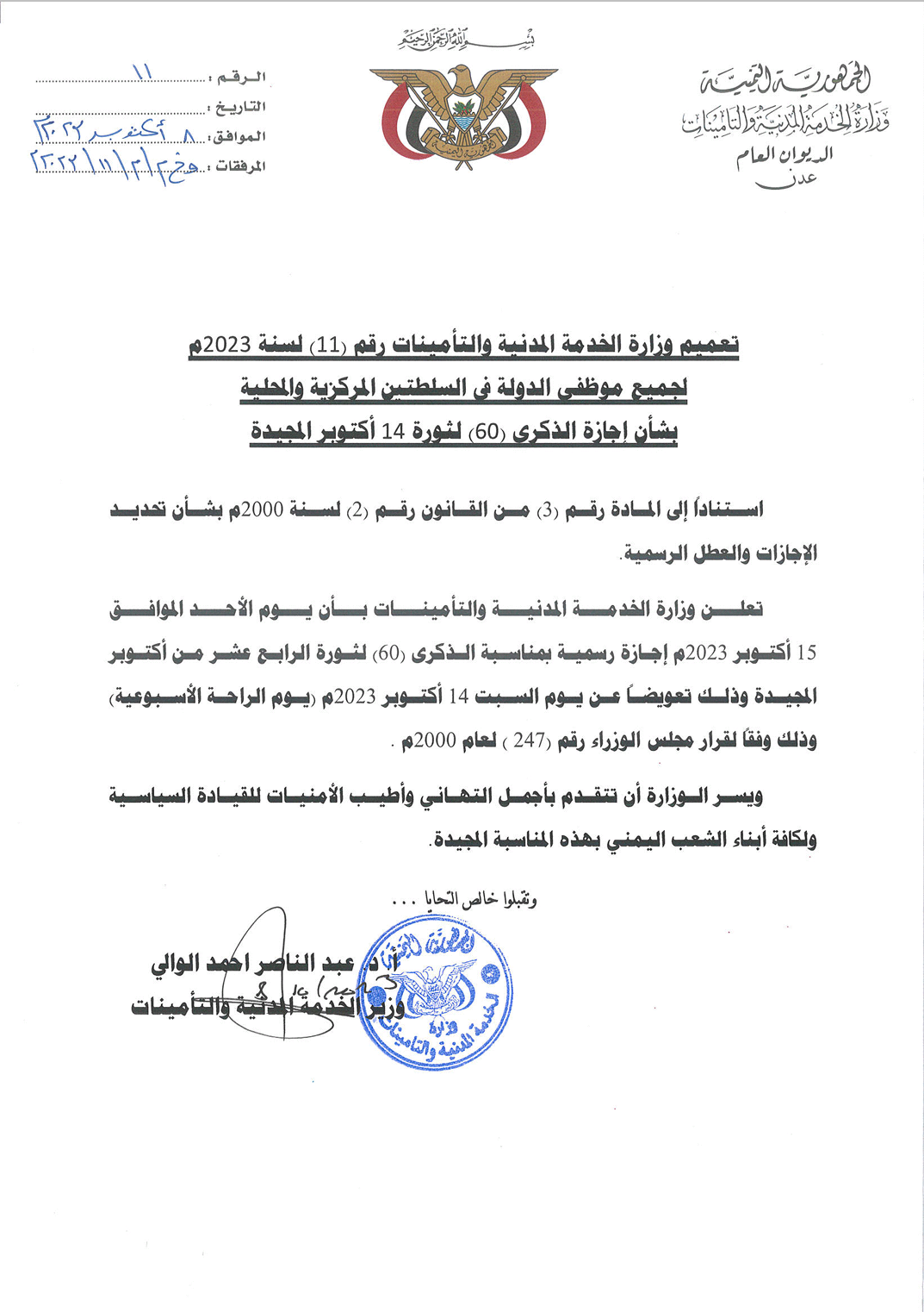 تعميم وزارة الخدمة المدنية و التأمينات بشأن اجازة عيد ثورة ١٤ اكتوبر المجيدة