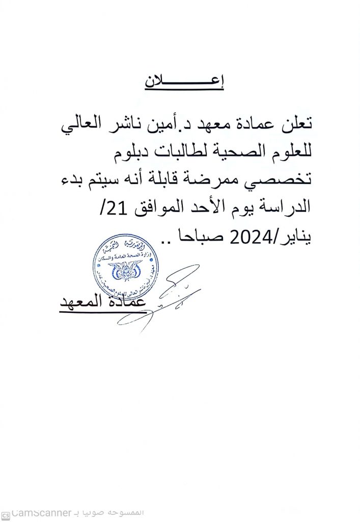 الإعلان عن موعد بدء الدراسة للدبلوم التخصصي الممرضة القابلة يوم الاحد القادماعلان 2024-01-16zuhaer ahmad