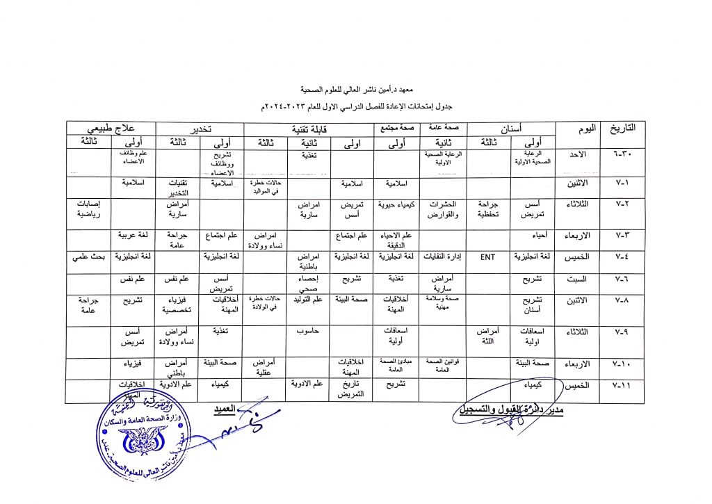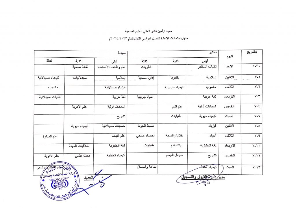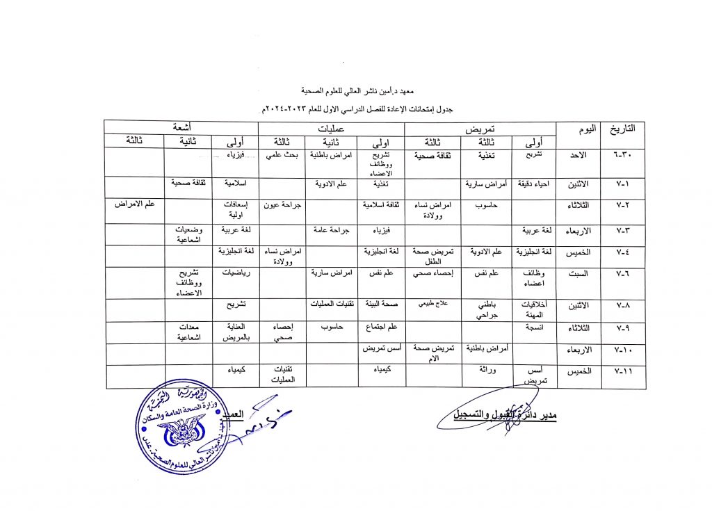 جدول امتحانات الاعادة للفصل الاول للعام الدراسي ٢٠٢٣ – ٢٠٢٤ مجدول امتحانات الاعادة للفصل الدراسي الأول للعام الدراسي 2023 – 2024 متنويه : على جميع الطلاب الذين لديهم مواد للاعادة سداد رسوم الاعادة قبل بدء الامتحانات مالم سيحرم الطالب او الطالبة من أداء امتحانات الاعادة 2024-06-24zuhaer ahmad