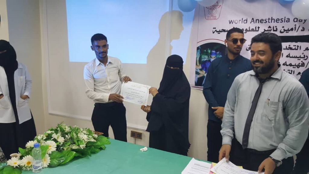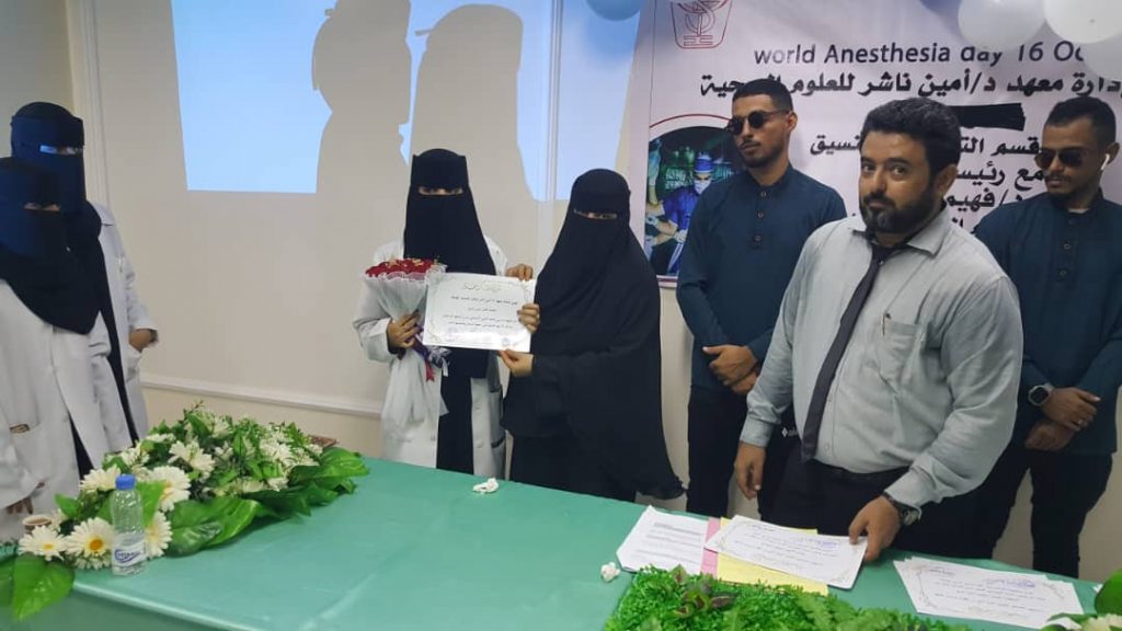 اقيمت اليوم بمعهد د. أمين ناشر العالي للعلوم الصحية و برعاية من عميد المعهد د. جمال ناصر امذيب احتفالية بمناسبة اليوم العالمي للتخدير و بأشراف من الاستاذة / فهيمة قائد رئيسة قسم التخدير و بتنفيذ طلاب و طالبات قسم التخدير بالمعهد حيث بدأت الفعالية بتلاوة من ايات الذكر الحكيم ثم كلمات ترحيبية من قبل طلاب و طالبات القسم بالحضور الكريم ثم قدمت الاستاذه فهيمة قائد نبذة تعيفية باهمية التخدير و نشأته الاولى سارده تطوره التاريخي و امكانياته الاخيرة في عالم الطب و تطبيقات الذكاء الصناعي.