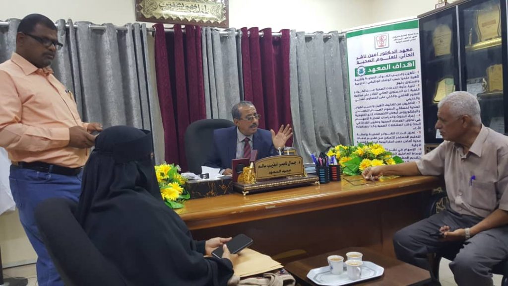 استقبل الدكتور / جمال ناصر امذيب عميد معهد د. أمين ناشر العالي للعلوم الصحية في مكتبه اليوم الأستاذ/ فؤاد طاهر سالم مدير الصندوق الاجتماعي للتنمية فرع عدن و الأستاذة/ يمن فتاح ضابط مشاريع الصحة و التغذية.