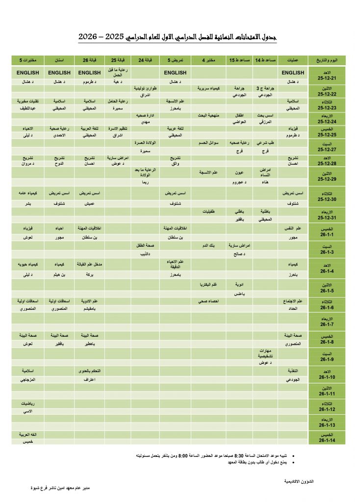 جدول امتحانات الفصل الاول للعام الدراسي 2025 / 2026 لفرع معهد الدكتور أمين ناشر العالي فرع م/ شبوةجدول امتحانات الفصل الاول للعام الدراسي 2025 / 2026 لفرع معهد الدكتور أمين ناشر العالي فرع م/ شبوة 2025-12-14zuhaer ahmad