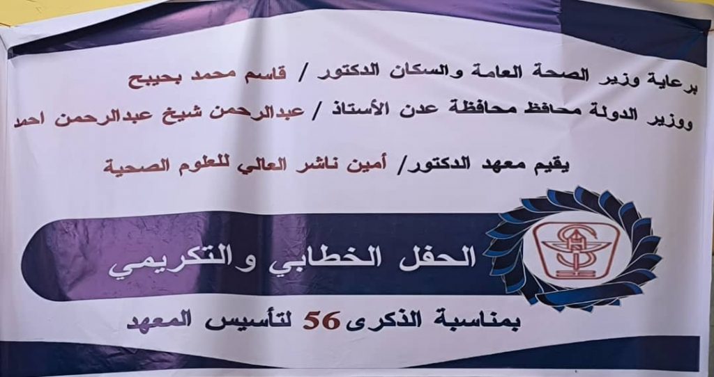 احتفل معهد الدكتور أمين ناشر العالي للعلوم الصحية بالعاصمة المؤقتة عدن اليوم بالعيد السادس والخمسين لتأسيسه من خلال إقامة حفل خطابي وتكريمي عكس المكانة العلمية العريقة للمعهد ودوره الريادي في إعداد وتأهيل الكوادر الصحية المؤهلة لخدمة القطاع الصحي في اليمن