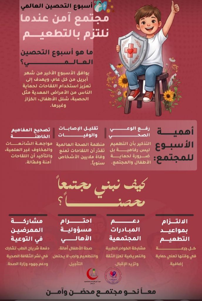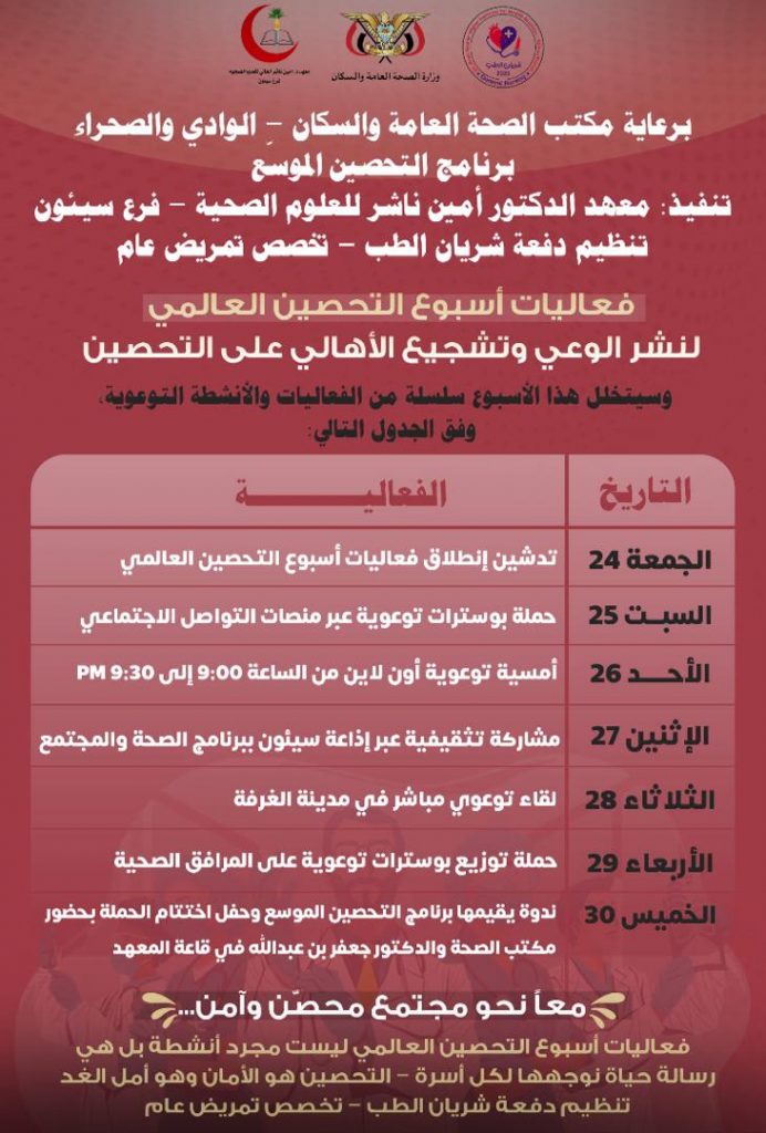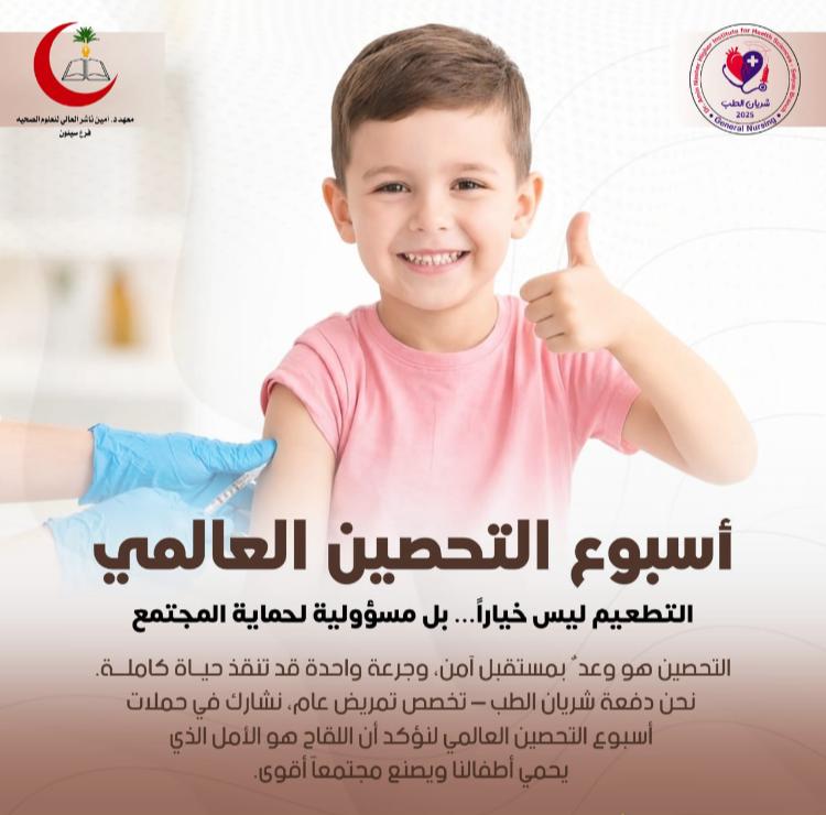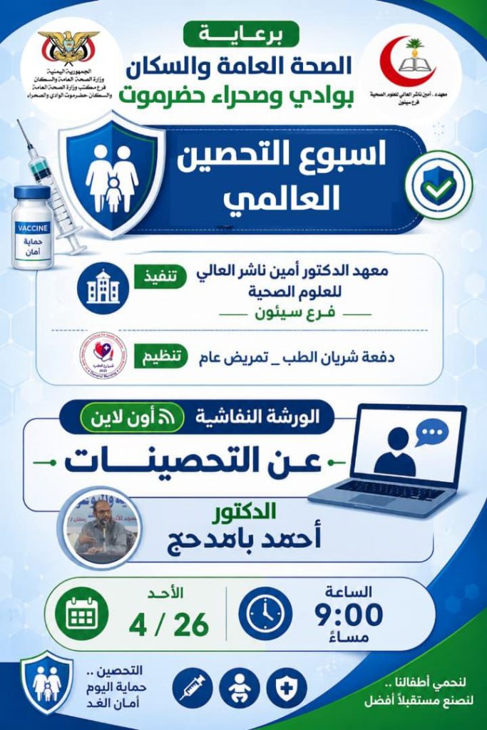 برعاية من مكتب الصحة العامة والسكان /الوادي والصحراء (برنامج التحصين الموسع) و تحت شعار ” معا نحو مجتمع محصن و امن ” تنظم دفعة شريان الحياة تخصص تمريض عام بمعهد د. أمين ناشر للعلوم الصحية فرع سيئون تنفيذ فعاليات “أسبوع التحصين العالمي” لنشر الوعي و تشجيع الأهالي على التحصين من خلال العديد من الأنشطة التوعوية حيث دشن الأسبوع العالمي للتحصين من يوم الجمعة 24 / 4 / 2026 م و يتم من خلال جدول منظم لأيام الأسبوع التوعوي