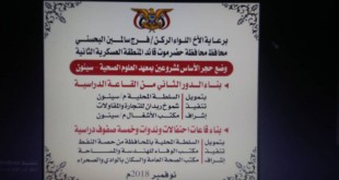 برعاية الأخ اللواء الركن / فرج سالمين البحسني محافظ محافظة حضرموت قائد المنطقة العسكرية الثانية تم وضع حجر الأساس لمشروعين بمعهد العلوم الصحية – سيئون : 1 – بناء الدور الثاني من القاعة الدراسية بتمويل السلطة المحلية م / سيئون و تنفيذ شكرة شموخ ريدان للتجارة و المقاولات و إشراف …
