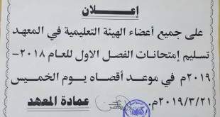 اعلان على جميع أعضاء الهيئة التعليمية في المعهد تسليم إمتحانات الفصل الأول للعام الدراسي ٢٠١٨ – ٢٠١٩م في موعد أقصاه يوم الخميس ٢١ / ٣ / ٢٠١٩ م. عمادة المعهد