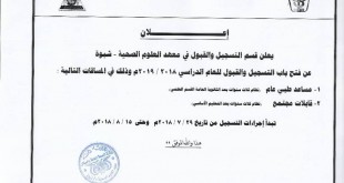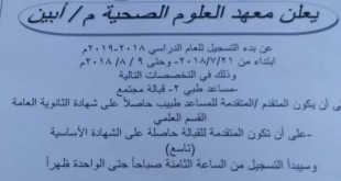 إعــلان يعلن معهد العلوم الصحية م / أبين عن بدء التسجيل للعام الدراسي 2018 / 2019 م ابتداءاً من : 21 / 7 / 2018 – 9 / 8 / 2019 م و ذلك في التخصصات التالية : 1- مساعد طبي. 2- قبالة مجتمع. على أن يكون المتقدم / المتقدمة …