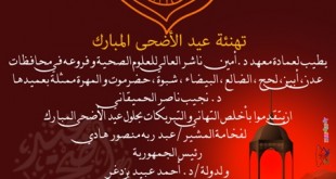 بـسـم الله الـرحـمـن الـرحـيـم يـطـيـب لـعـمـادة مـعـهـد د.أمين نـاشـر الـعـالـي لـلـعـلـوم الـصـحـيـة و فـروعـه فـي مـحـافـظـات عـدن ، أبـيـن ، لـحـج ، الـضـالـع ، الـبـيـضـاء ، شـبـوة ، حـضـرمـوت و الـمـهـرة مـمـثـلـة بـعـمـيـدهـا د. نـجـيـب نـاصـر الـحـمـيـقـانـي ان يـتـقـدمـوا بـأخـلـص الـتـهـانـي و الـتـبـريـكـات بـحـلـول عـيـد الأضـحـى الـمـبـارك لـفـخـامـة …