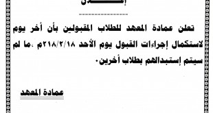 12 / 2 / 2018 م إعلان هام جداً للطلاب المقبولين حول إستكمال إجراءات القبول